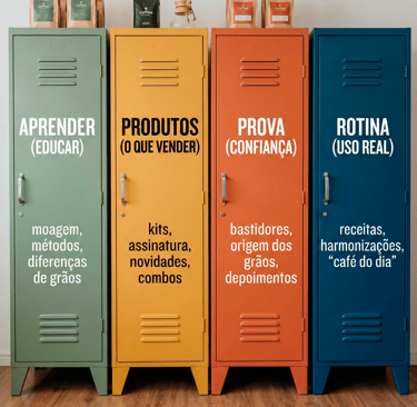 Imagine a Café Aurora, uma cafeteria artesanal que também vende online (grãos, kits e assinatura mensal). O objetivo deles não é “postar todo dia”. É trazer gente certa, gerar pedidos e aumentar a lista de contatos.